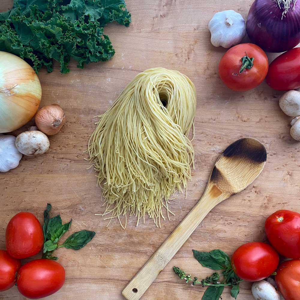 Our pasta is made fresh daily with GMO-free grains, and all of our flavored and vibrantly colored pasta is sourced from vegetable ingredients.