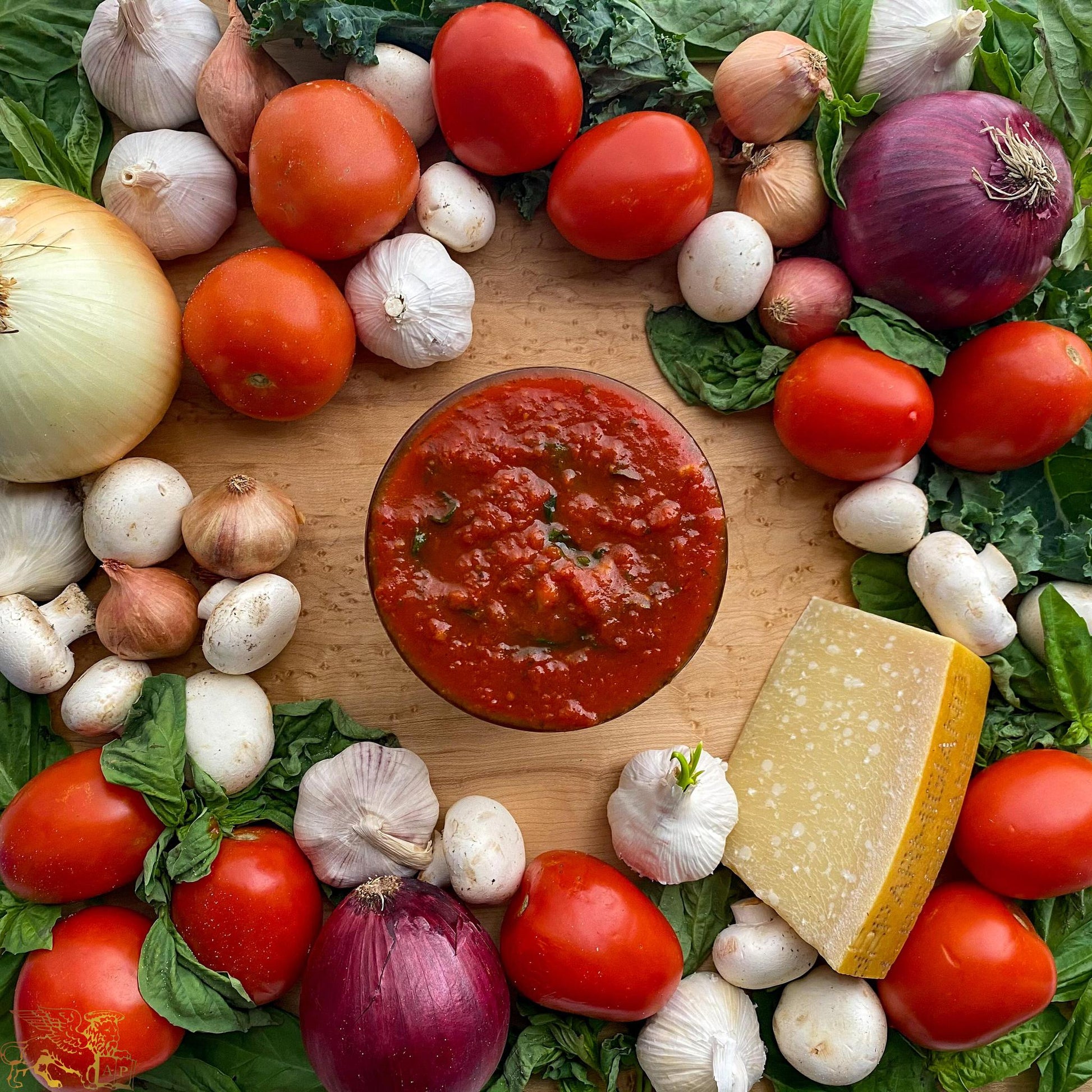Peeled tomato filets, fresh arugula, fresh garlic, olive oil, salt, pepper.