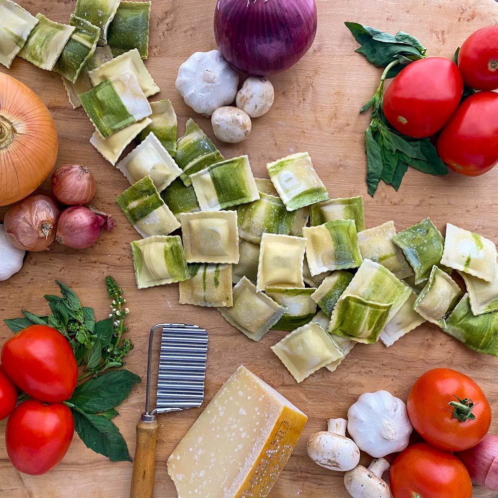 Pasta: Non-GMO Neapolitan 00 flour, eggs, water, spinach powder, salt.