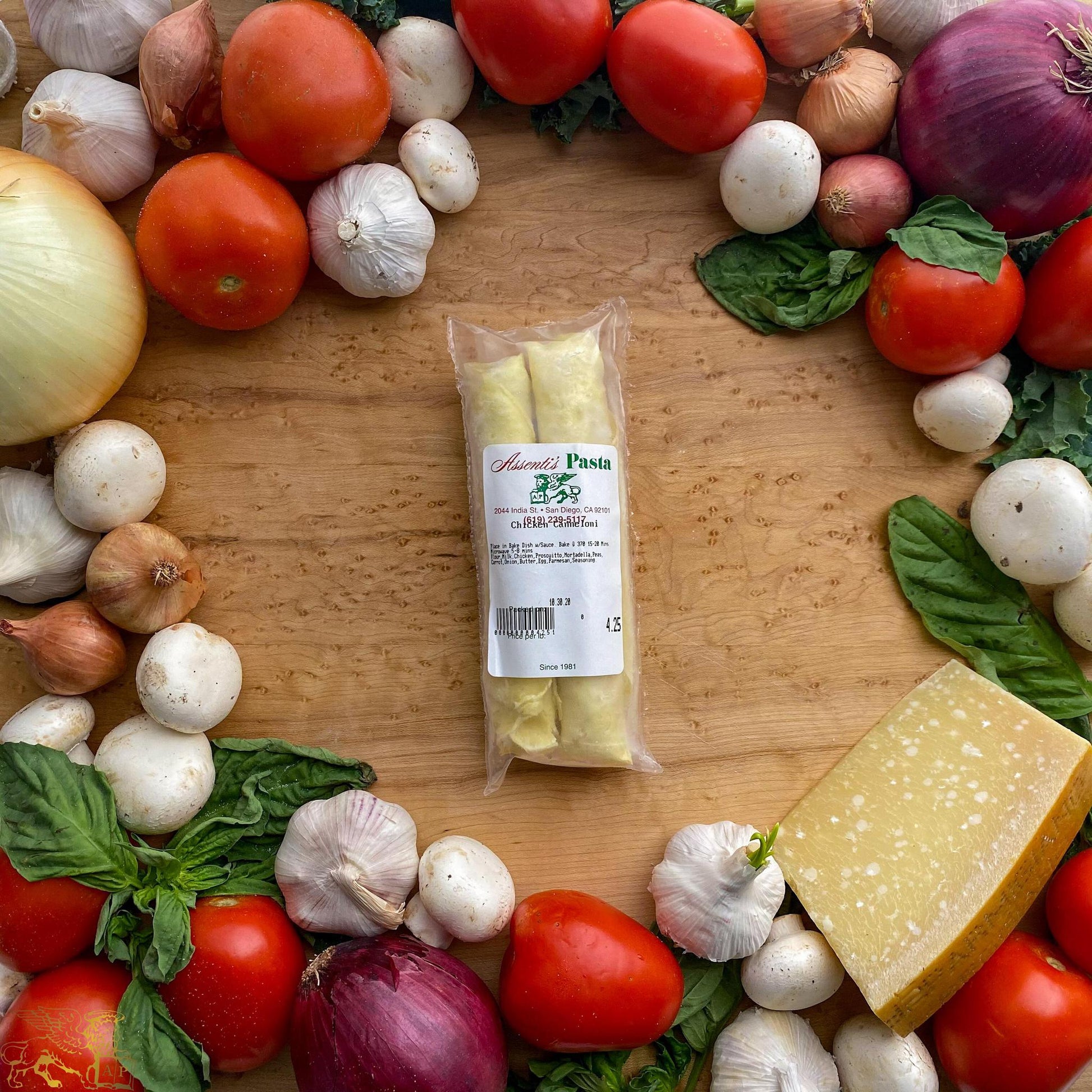 Filling: Assenti's Pasta Chicken Cannelloni filling: Flour, milk, chicken, prosciutto, mortadella, peas, carrots, onion, butter, egg, parmesan cheese, seasonings.
