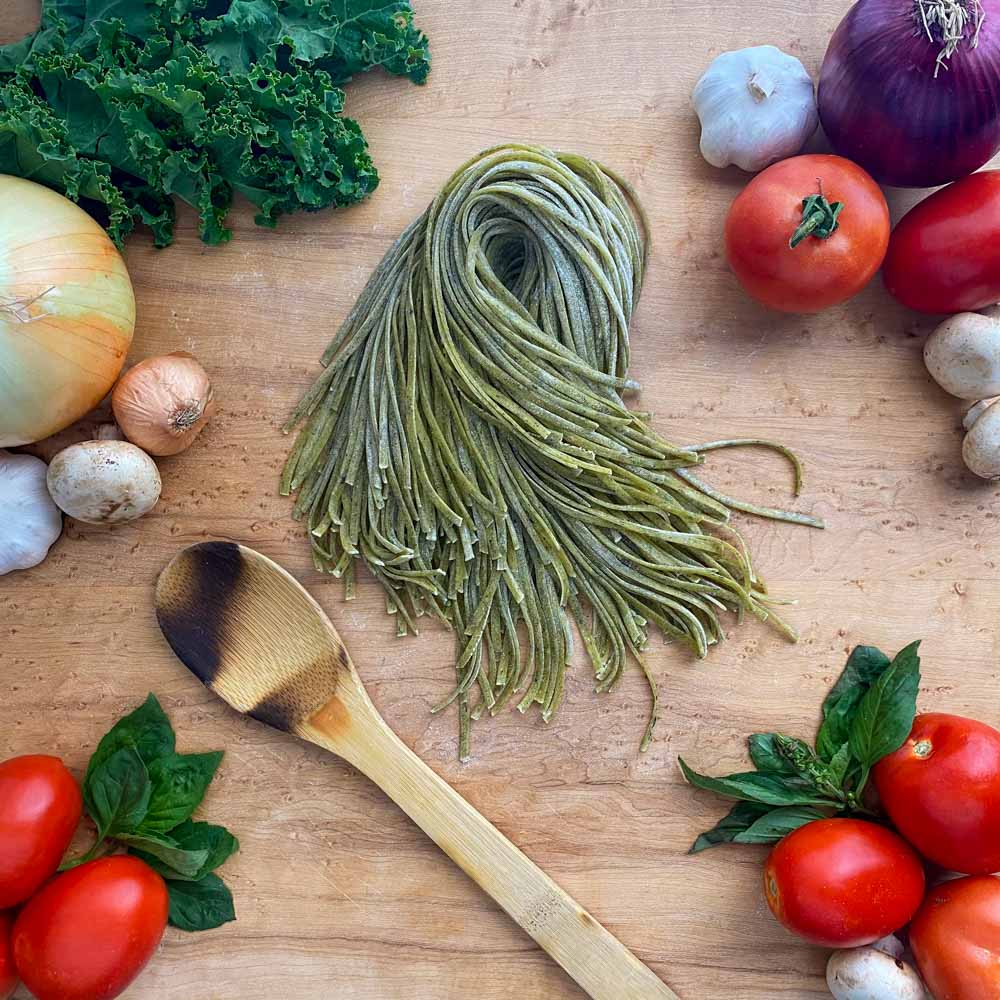 Our pasta is made fresh daily with GMO-free grains, and all of our flavored and vibrantly colored pasta is sourced from vegetable ingredients.