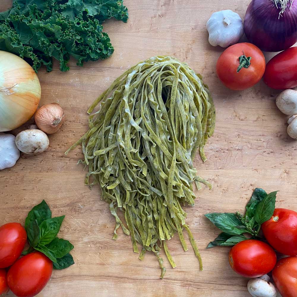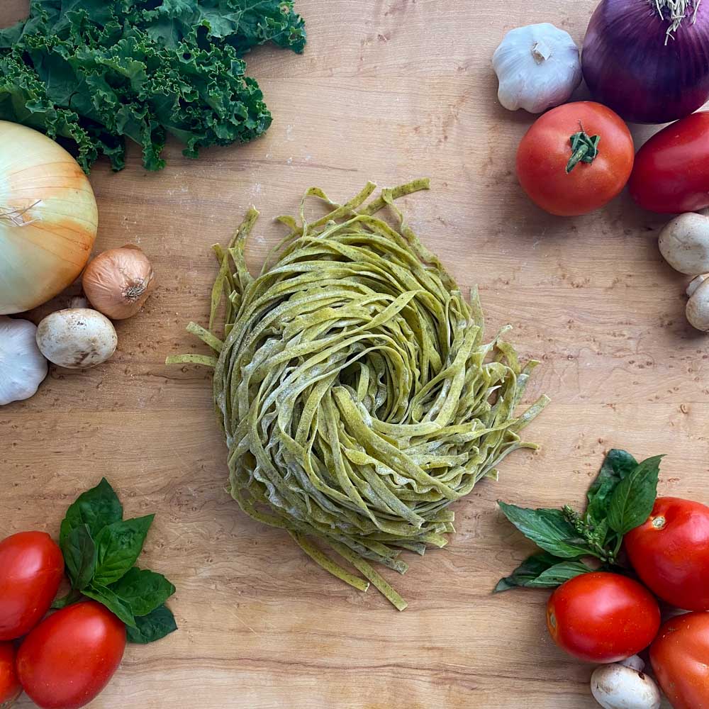 Our pasta is made fresh daily with GMO-free grains, and all of our flavored and vibrantly colored pasta is sourced from vegetable ingredients.