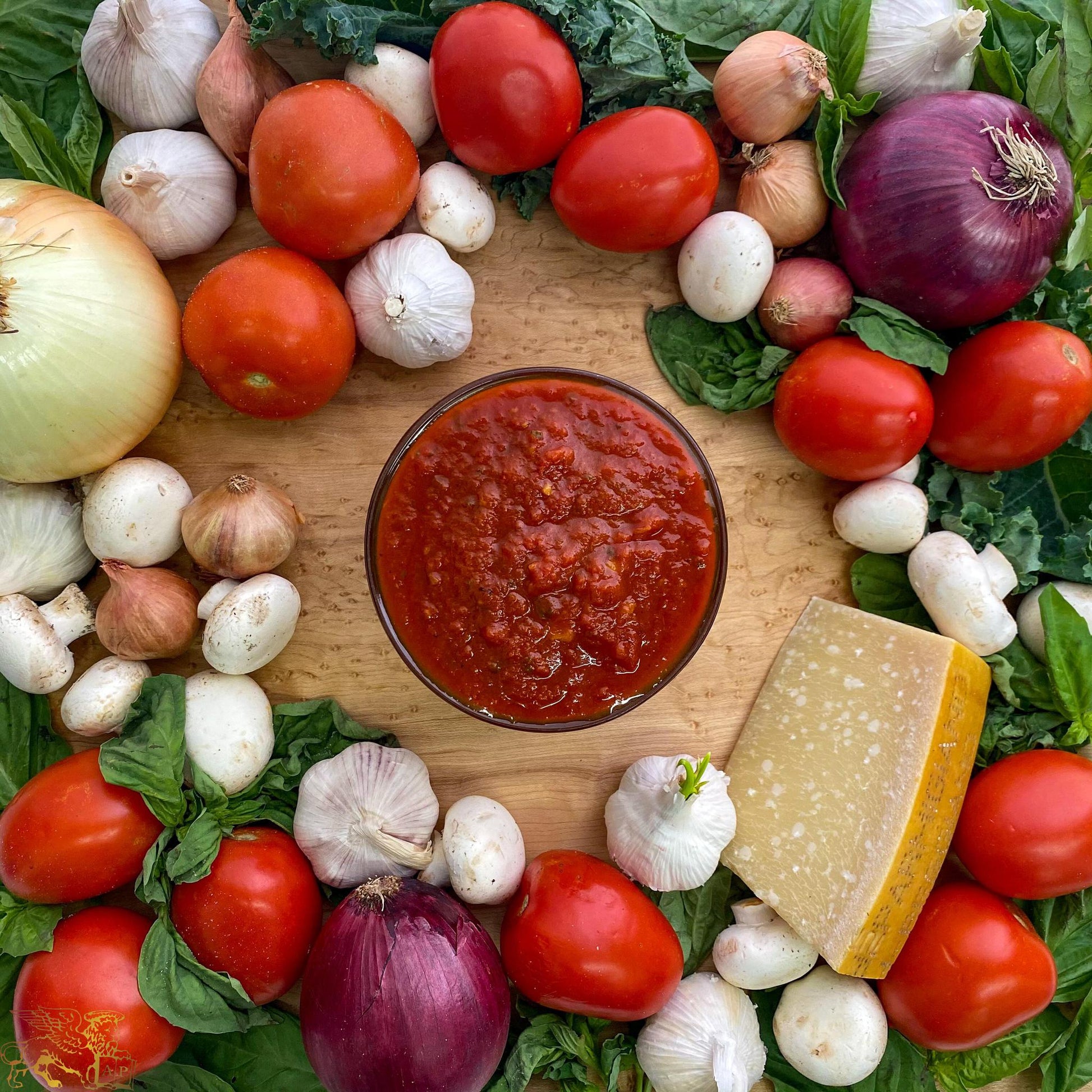 Crushed tomatoes, tomato purée, ground beef, onion, olive oil, parsley, basil, assorted seasonings.