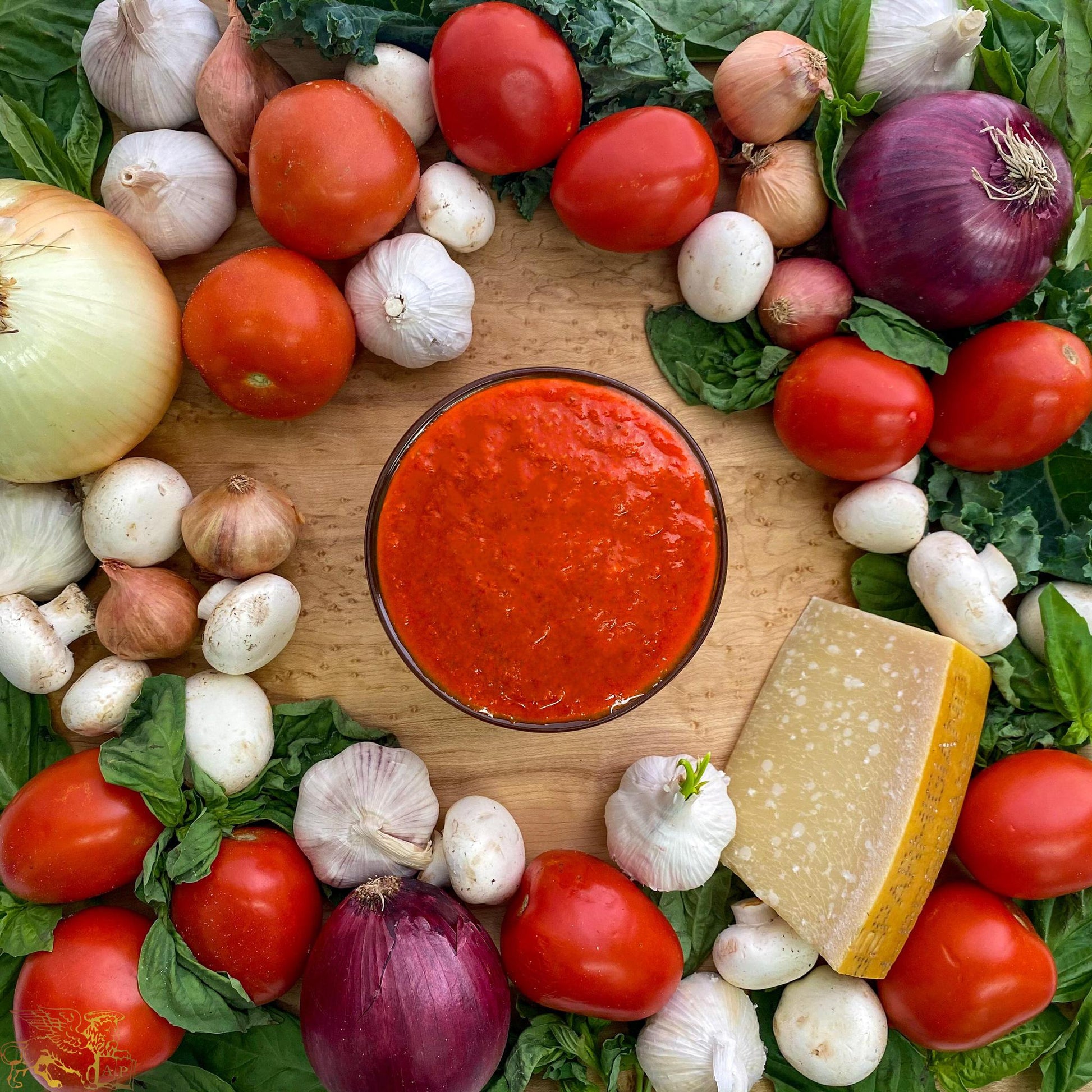 Tomatoes, onion, salt, garlic, oregano, black pepper.