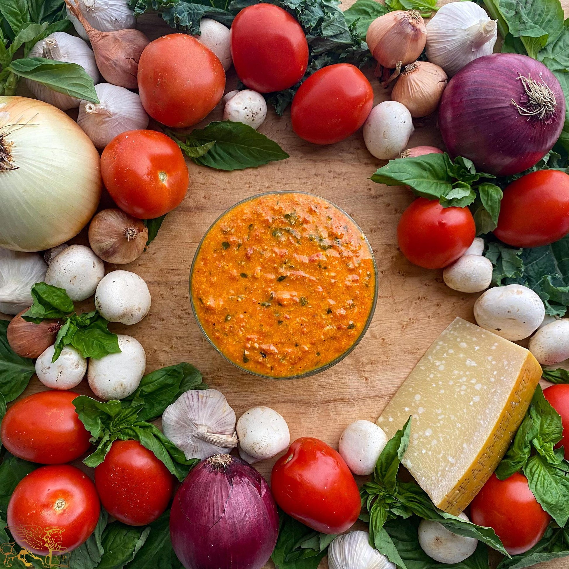 Roasted red bell peppers, olive oil, Romano cheese, roasted pinenuts, garlic, basil, salt and white pepper.