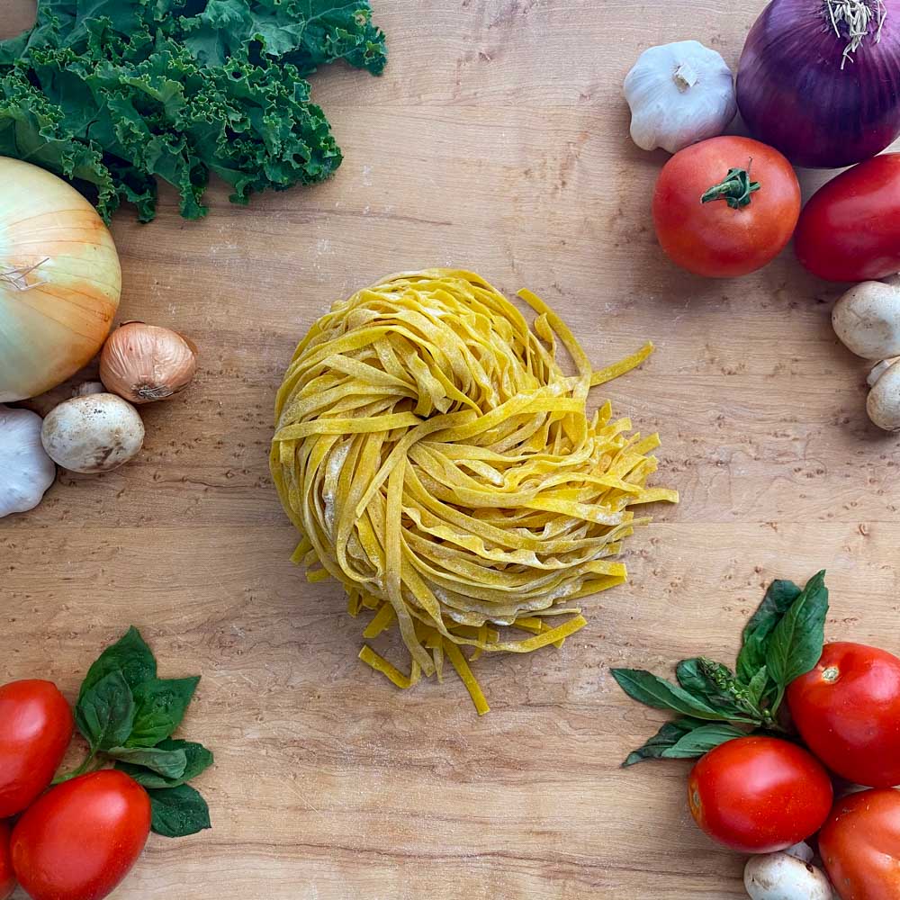 Our pasta is made fresh daily with GMO-free grains, and all of our flavored and vibrantly colored pasta is sourced from vegetable ingredients.