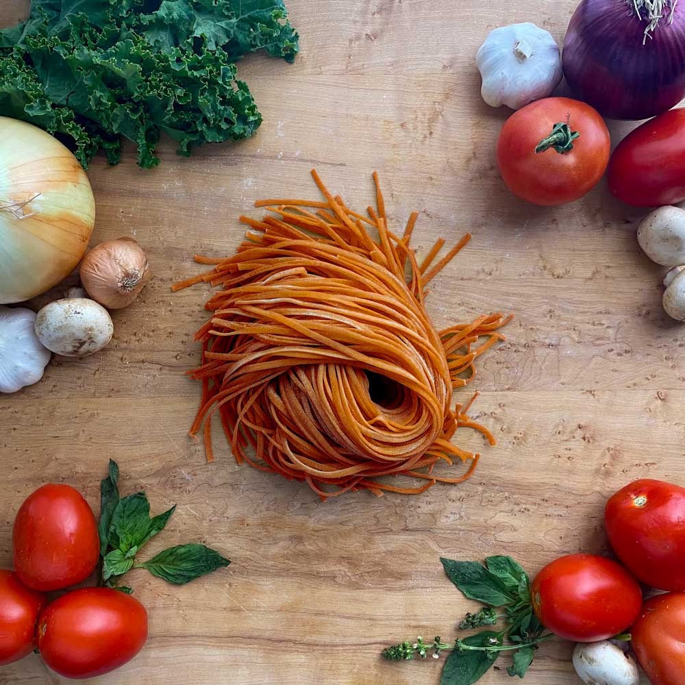 Our pasta is made fresh daily with GMO-free grains, and all of our flavored and vibrantly colored pasta is sourced from vegetable ingredients.